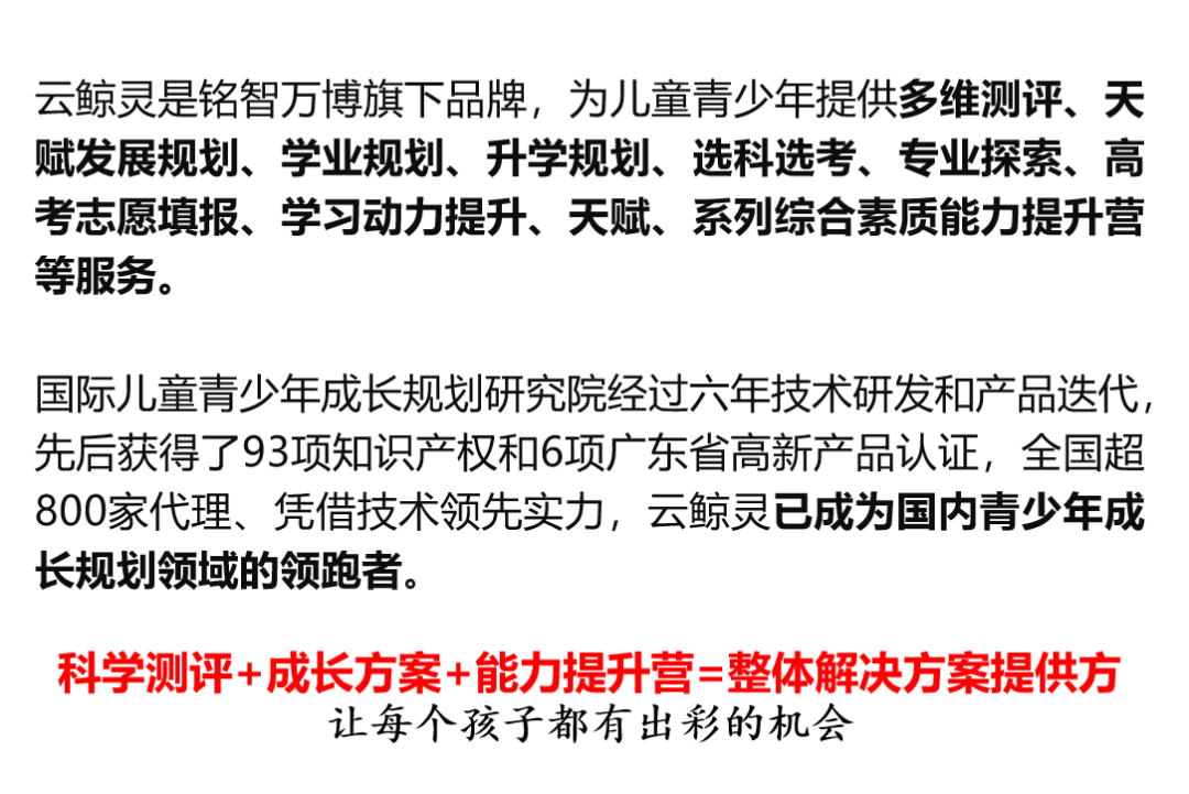 可见新时代家长的认知差与信息差,最终都是由孩子来买单,不仅埋没了孩子的个性天赋,更错过了适合孩子的升学路径。也正因很多家长不懂得教育规律和成长规划,愿意投入时间和金钱在云鲸灵成长中心,帮助他们更好地教育孩子。